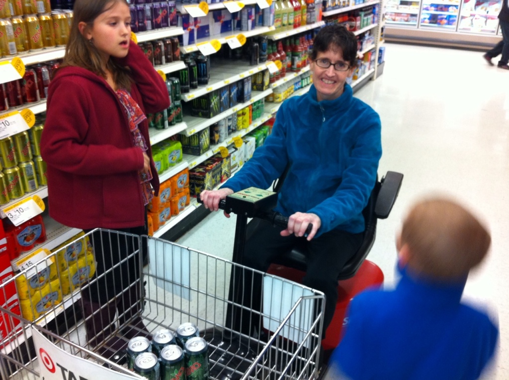This is Tara in Target after the Mall experience. From the next isle over I heard a crash. You’d think at 1 MPH she could avoid the corners. It was hilarious.